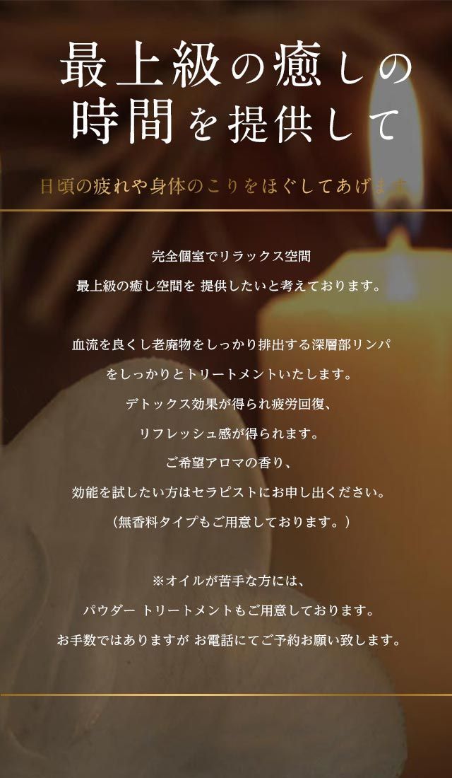 当店では癒しを目的とした心地よいサービスを提供致します。お客様の心身のバランスが整い不快な症状が改善していきます。指圧やオイルを使いとくに疲れた部分をマッサージさせていただきます。オイルを使い、お客様の気になる部位を集中でリラクゼーションマッサージさせていただきます。セラピストはお客様とコミュニケーションを取りながら愛情一杯のしなやかな指先とやわらかい手のひらでお客様の疲れをとり、元気にさせていただきます。