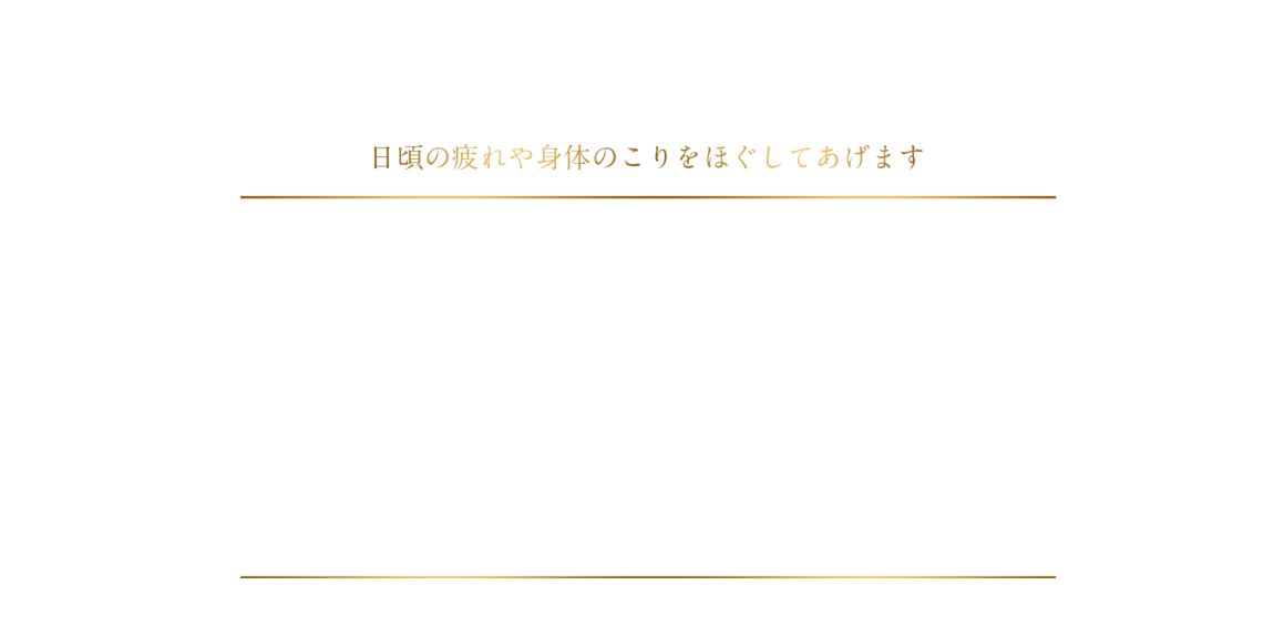 お客様のためのマッサージで今日の疲れを芯から癒します。時間やコースも選べるので、どれにするかも気分次第。気持ちも身体もリフレッシュ。また明日から頑張るぞ、と前向きな気持ちになっていただけたら幸いです。